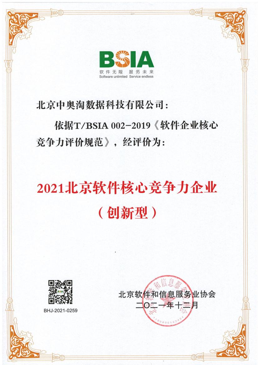 北京中奧獲評“2021北京軟件核心競爭力企業(創新型)”